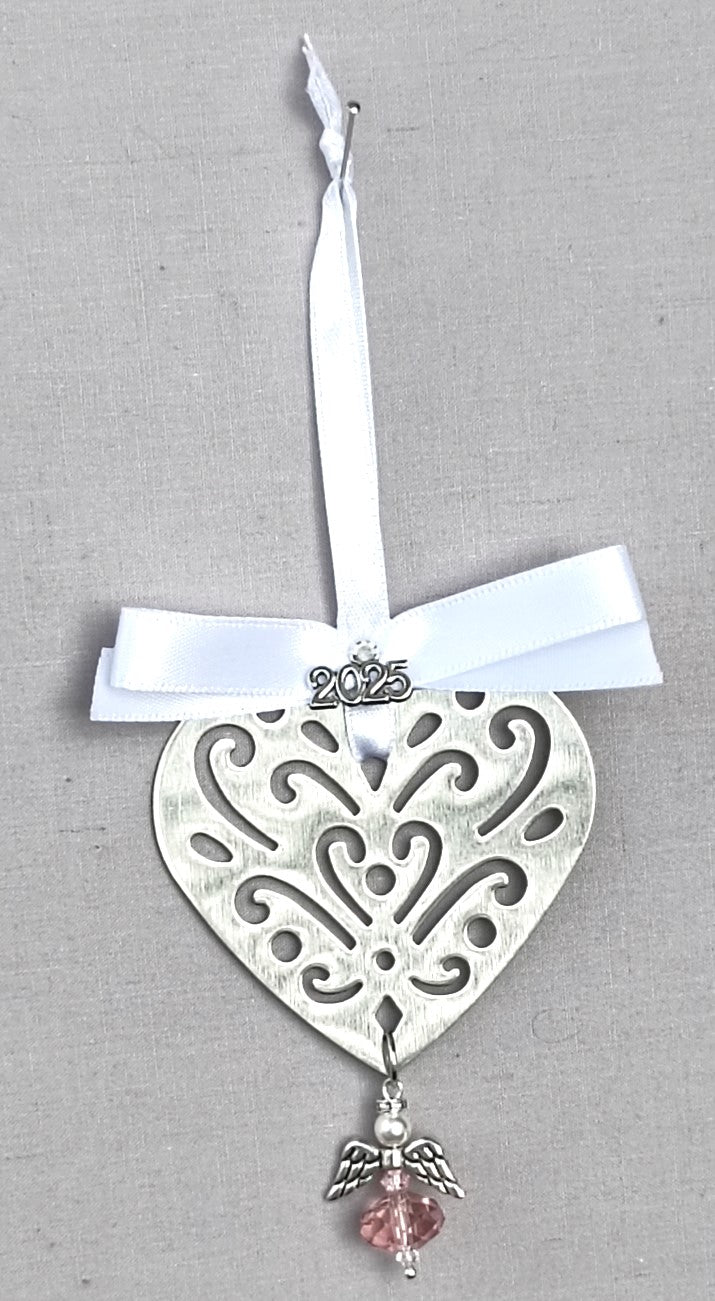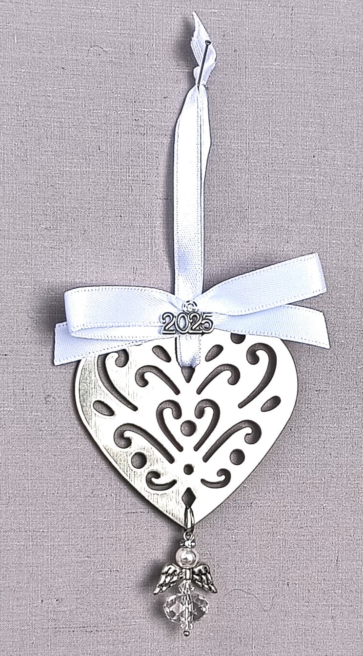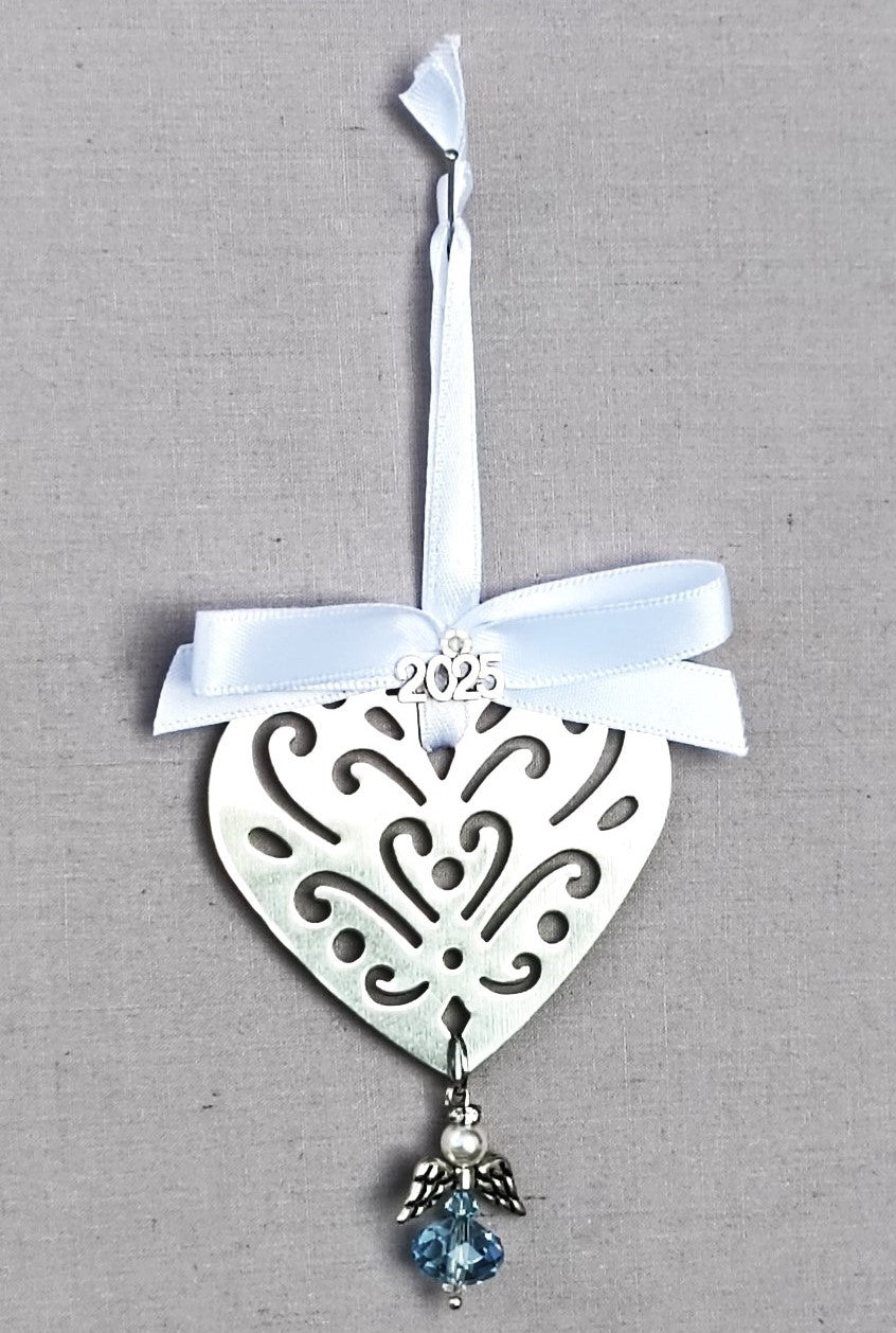 This decoration features a silver metal stamped heart. Our beautiful signature Swarovski angel pendant is suspended from the bottom edge. A white ribbon hanging loop is finished with a satin ribbon bow and embellished with a silver metal 2025 charm.